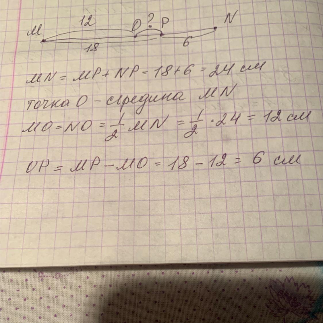 Точка Р належить відрізку MN.Чому дорівнює відстань між точкою Р і серединою відрізка MN, якщо МР = 18 см, NP = 6 см?