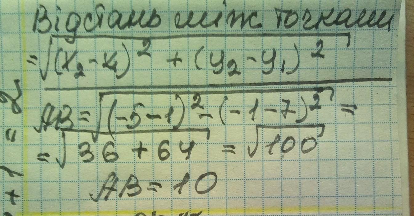 Знайдіть відстань між двома точками А (1; 7) і В (-5; -1).