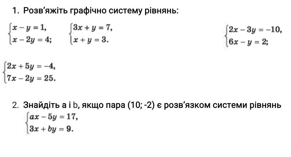 1. Розв'яжіть x - y = 1, x-2y = 4; 2x +5у = -4, 7x-2y = 25. графічно систему рівнянь: [3x + y = 7, x + y = 3. 2x-3y=-10, 6x - y = 2; 2. Знайдіть a i b, якщо пара (10; -2) є розв'язком системи рівнянь ax-5y=17, 3x + by = 9.