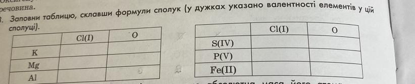 3. Заповни таблицю, склавши формули сполук (у дужках указано валентності елементів у цій сполуці)