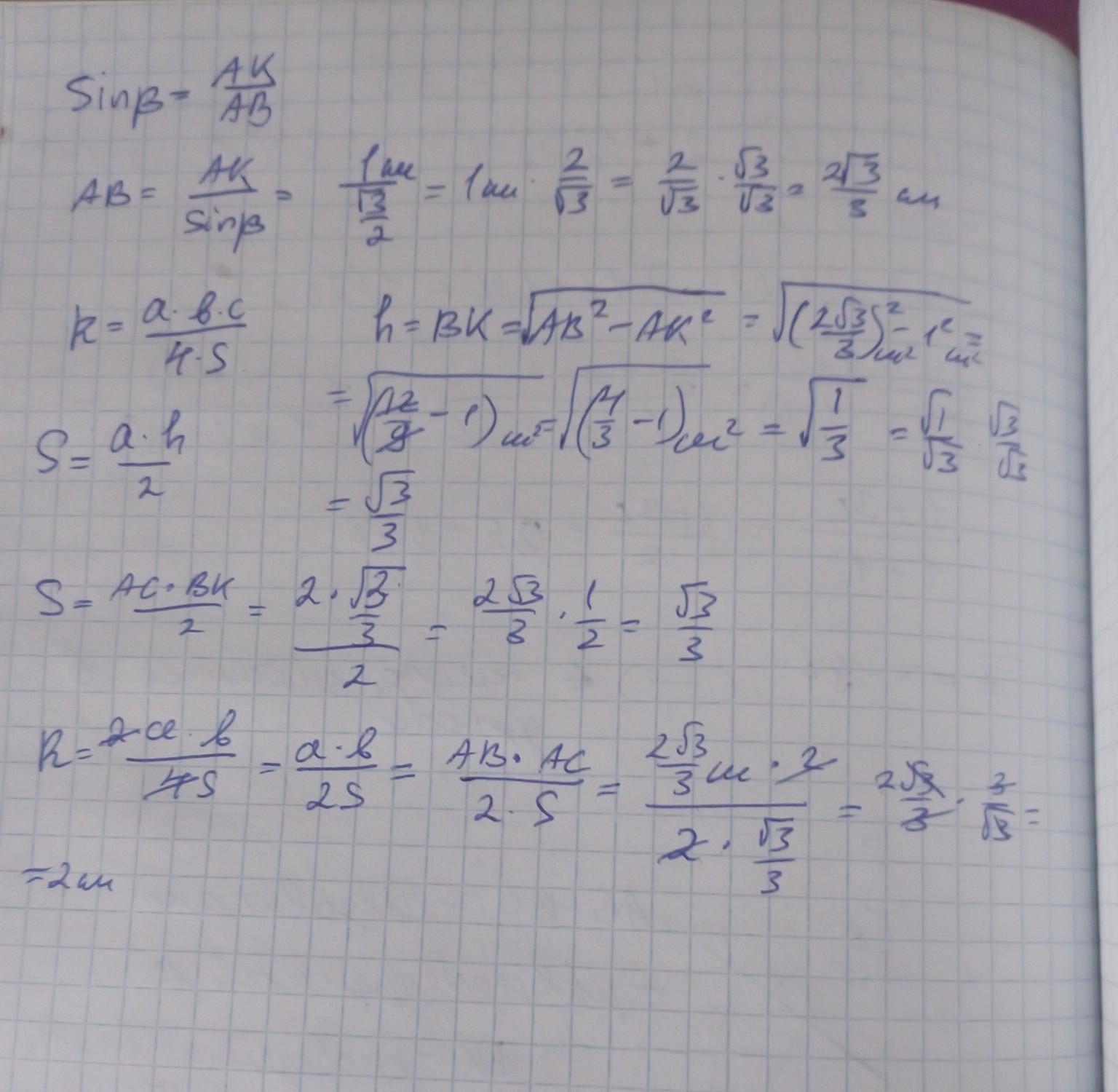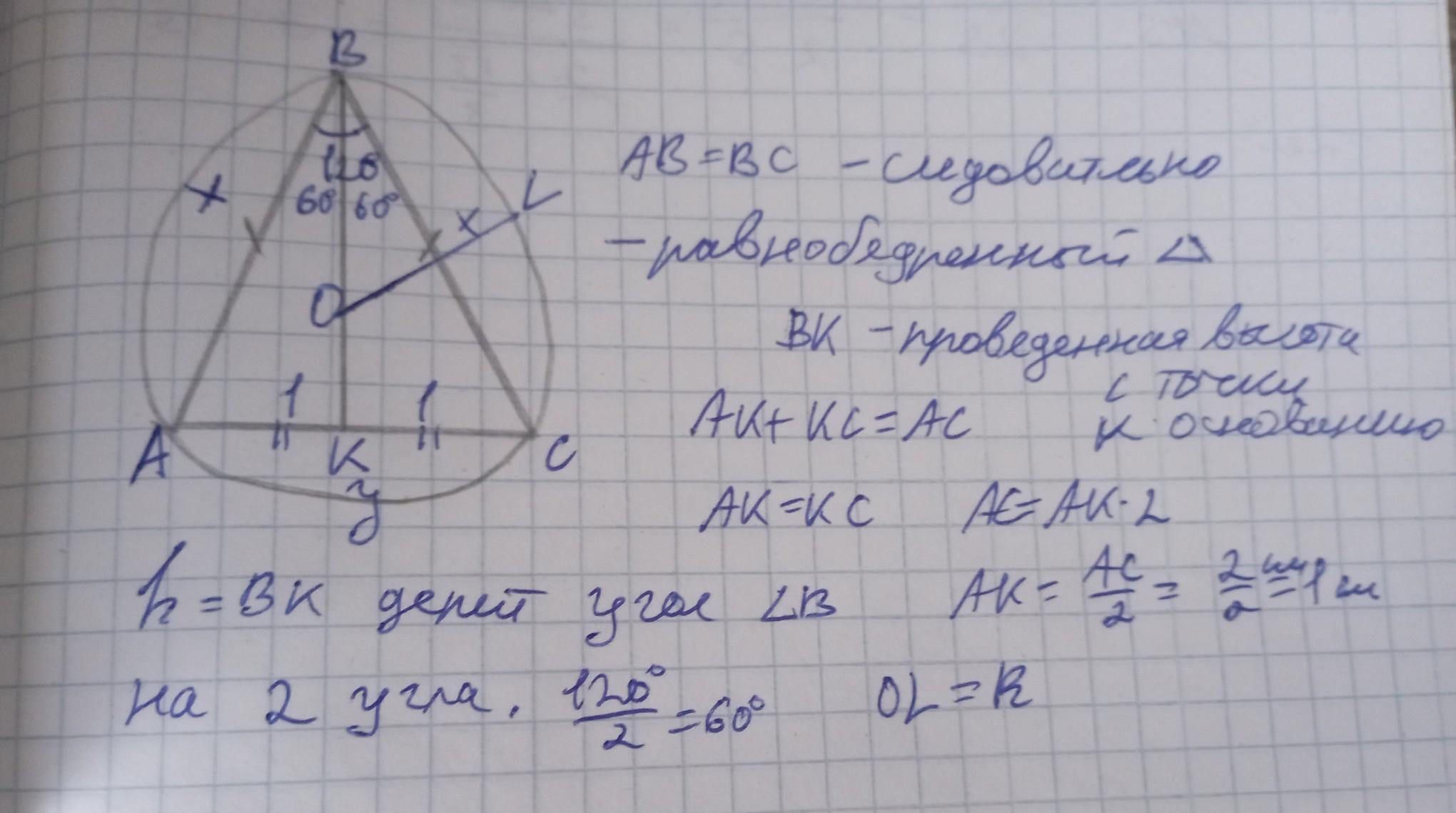 . У трикутнику ABC AB=BC ,AC = 2,∠B = 120° . Знайти AB , радіус описаного кола і площу трикутника