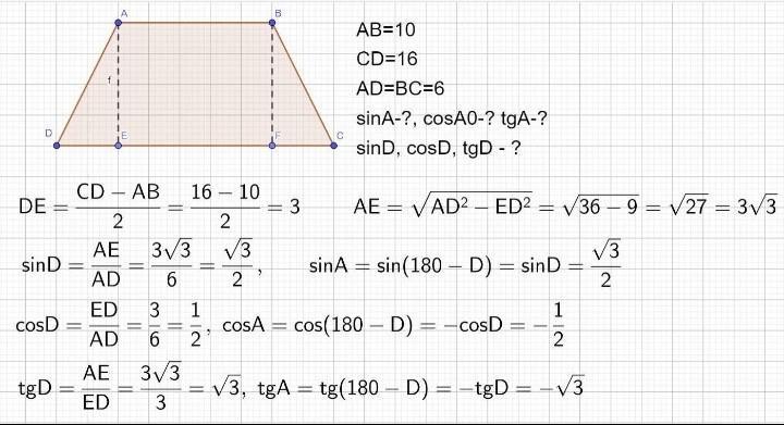 Срочно помогите !!!! Знайдіть синуси, косинуси і тангенси кутів рівнобічної трапеції, основи якої дорівнюють 10 см і 16 см, а бічна сторона 6 см.