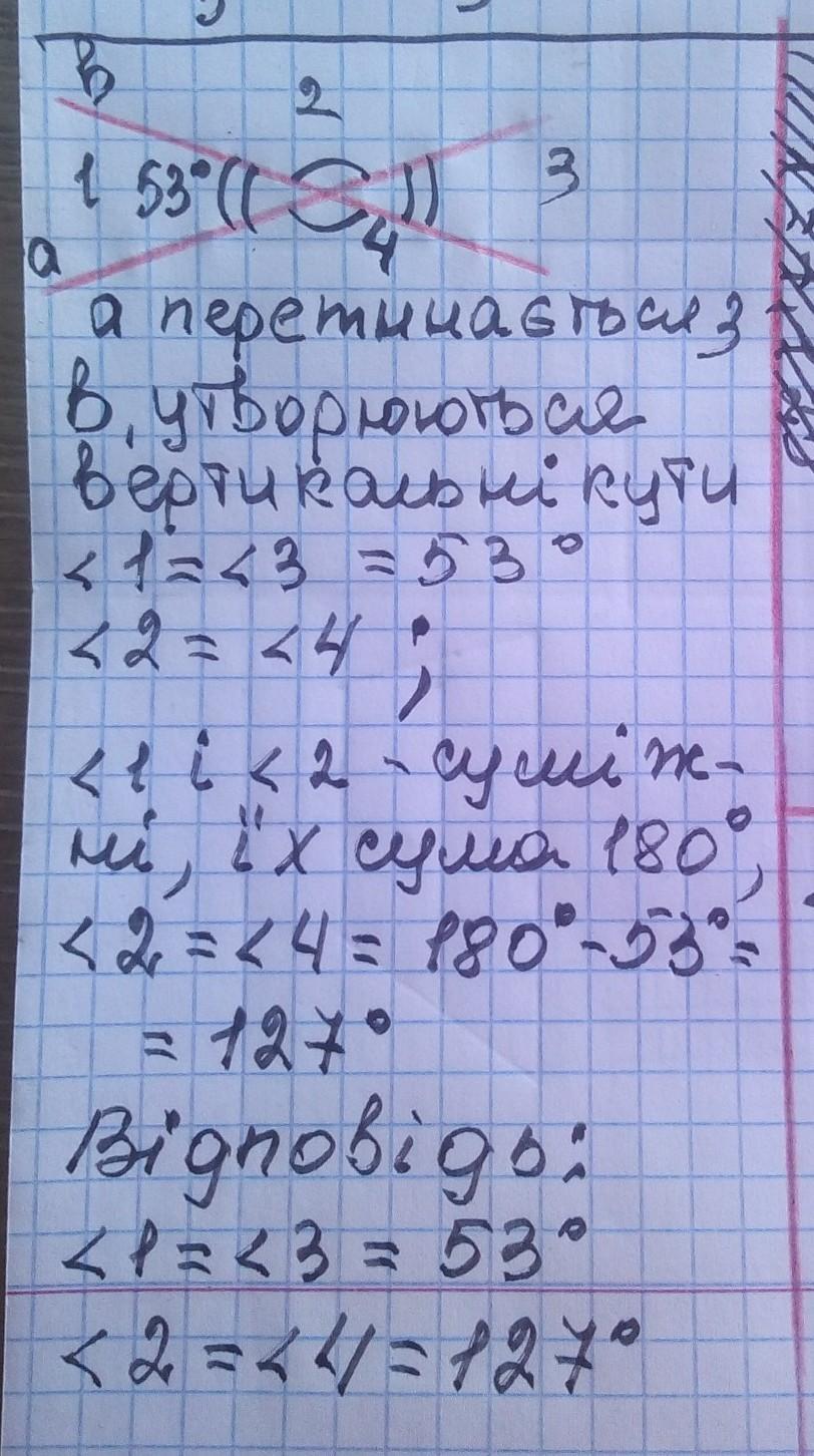 найти величину кожного кутив яки утворюються при перетини двох прямих якшо один из них доривнюе 53градуси