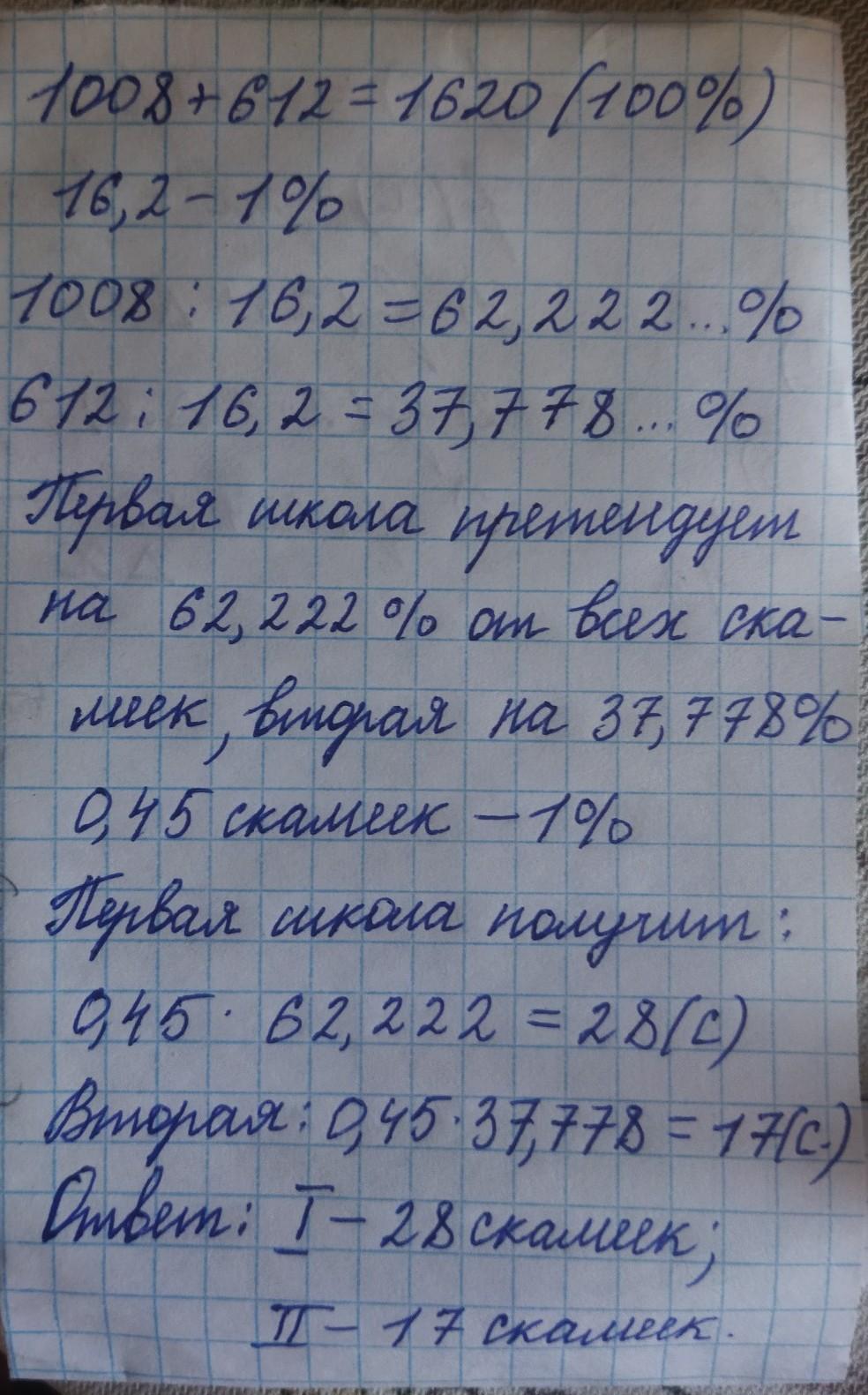 Две школы совместно купили 45 скамеек. первая школа внесла в цену покупки 1008 евро, а другая — 612 евро. Сколько бы скамеек получила каждая школа, если бы скамейки стоили одинаково?