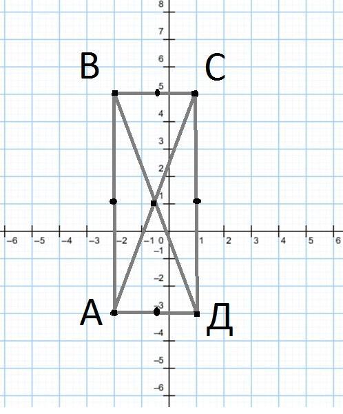 б) координати точки D (1; -3), координати середин сторін прямокутника: