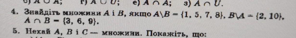 А/В ( А без В) это числа , которые есть во множестве А=(1,5,7,8) добавляем туда числа из пересечения множеств А и В (3,6,9), получаем множество А=(1,5,7,8,3,6,9)