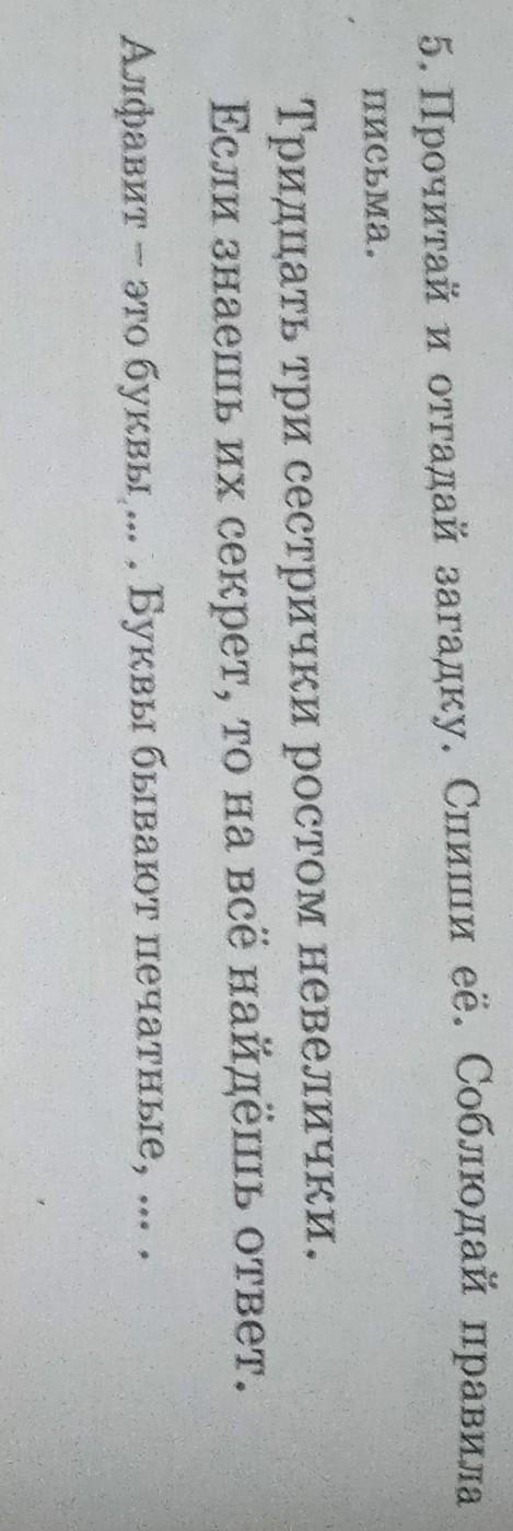 5. Прочитай и отгадай загадку. Спиши её. Соблюдай правила письма. Тридцать три сестрички ростом невелички. Если знаешь их секрет, то на всё найдёшь ответ. Алфавит - это буквы ... . Буквы бывают печатные,