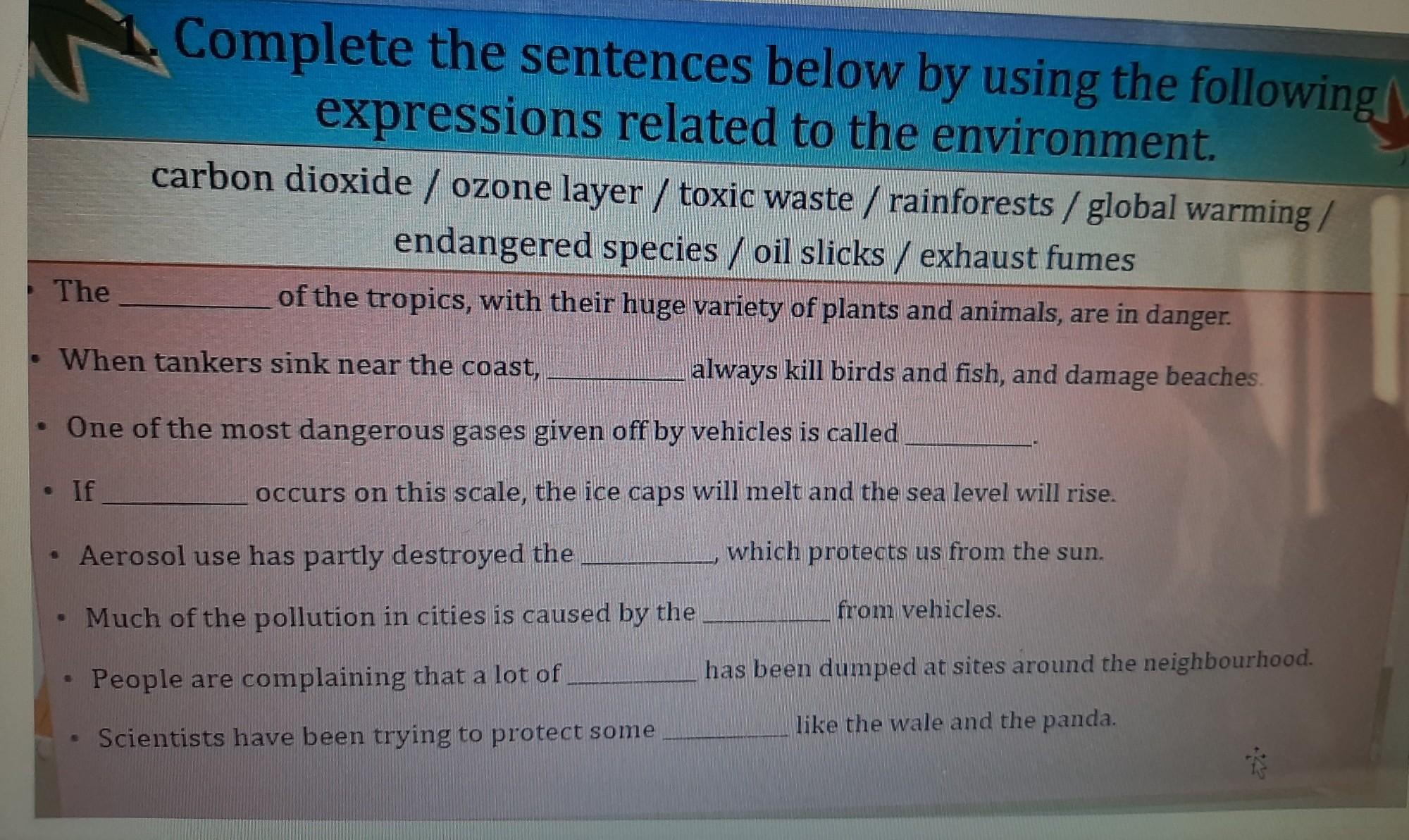 The Complete the sentences below by using the following expressions related to the environment. If carbon dioxide / ozone layer / toxic waste / rainforests/global warming/ endangered species / oil slicks/ exhaust fumes