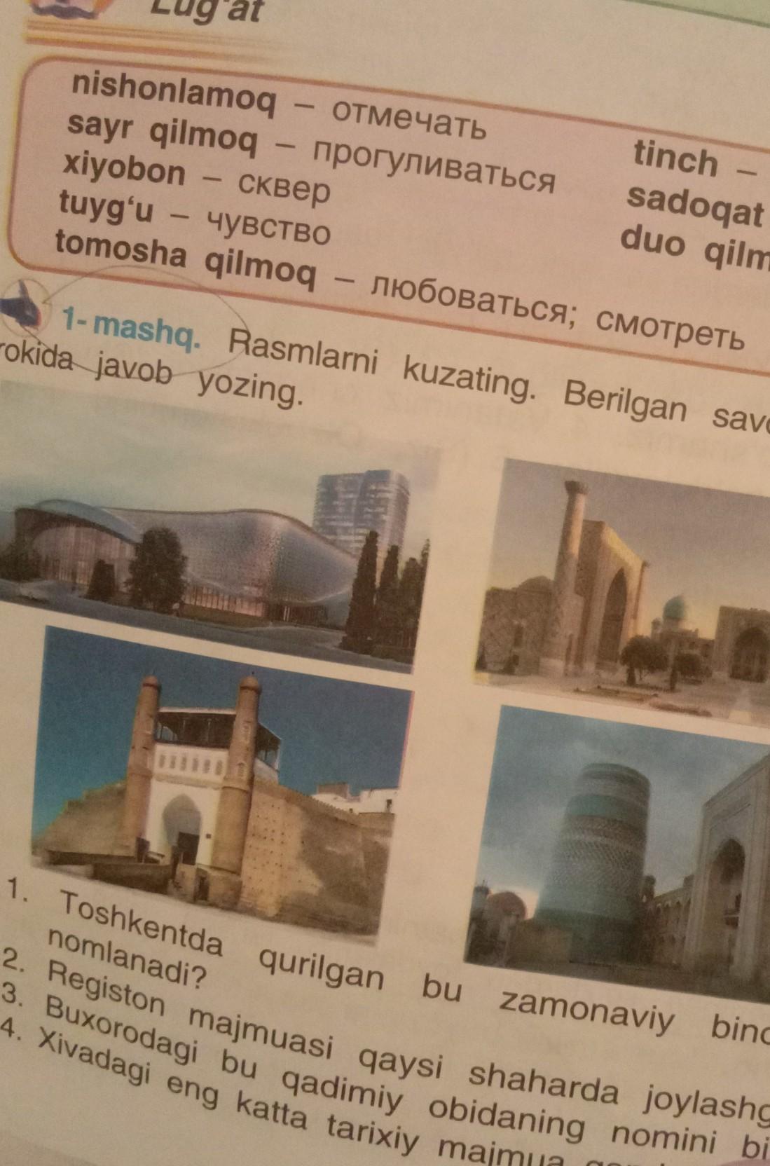 1-mashq. Rasmlarni kuzating. Berilgan savollarga otlar ishti- rokida javob yozing. 1. Toshkentda qurilgan bu zamonaviy bino qanday nomlanadi? 2. Registon majmuasi qaysi shaharda joylashgan? 3. Buxorodagi bu qadimiy obidaning nomini bilan 4. Xivadagi eng katta tarixiy majmua qanday nomlanadi?
