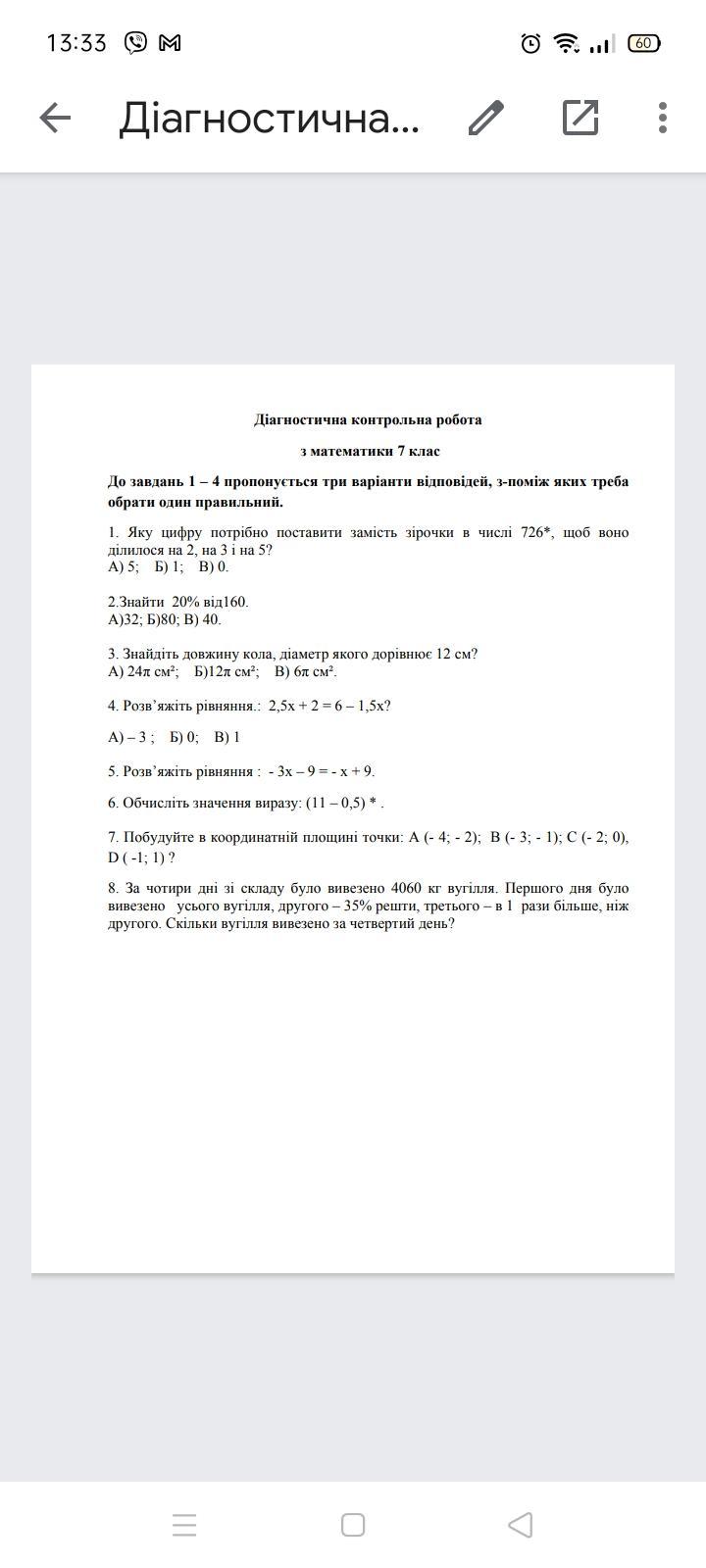Діагностична контрольна робота з математики 7 клас будь ласка допоможіть даю 20 балів срочно очень нужна будь ласка усі питання