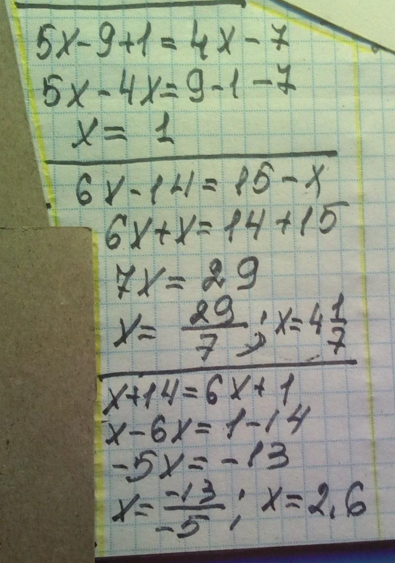 решите уравнение:1)5х-9+1=4х-7. 2)6х-14=15-х. 3)х+14=6х+1 помогите пожалуйста срочно пожалуйста срочно
