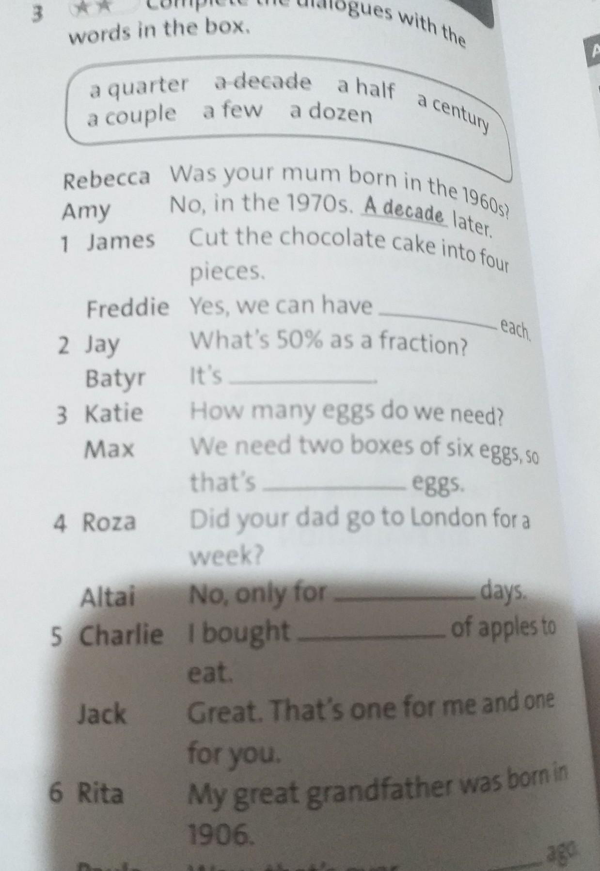 Дополните диалоги словами в рамке. четверть десятилетия полвека пару несколько десятков Ребекка Ваша мама родилась в 1960-х? Эми Нет, в 1970-х. Десять лет спустя. 1 Джеймс Разрежьте шоколадный торт на четыре части Фредди 2 Джей Батыр 3 Кэти Макс 4 Роза Алтай 5 Чарли Джек 6 Рита Паула. Да, мы можем получить 50% в виде дроби? каждый. Сколько яиц нам нужно? Нам нужно две коробки по шесть яиц, так что это яйца. Твой папа ездил в Лондон на неделю? Нет, только на купленные дни. яблок, чтобы поесть. Большой. Это один для меня и один для вас. Мой прадедушка родился в 1906 году. Ничего себе, это было давно.