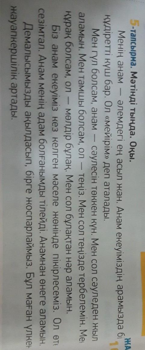 ЖАЗЫЛЫМ АЙТЫЛЫМ 6-тапсырма. Мәтін мазмұны бойынша жоспар құр. Жоспардағы әр такы- рыпшаның тұсына Tipek сөздерді жаз. Сол сөздерге сүйеніп, мәтiндi мазмұнда. Көптiк мәндi есiмдердi аныкта.