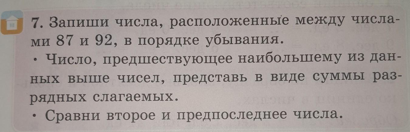 7. Запиши числа, расположенные между числа- ми 87 и 92, в порядке убывания. Число, предшествующее наибольшему из дан- ных выше чисел, представь в виде суммы раз- рядных слагаемых. Сравни второе и предпоследнее числа. помните пожалуйста выполнить