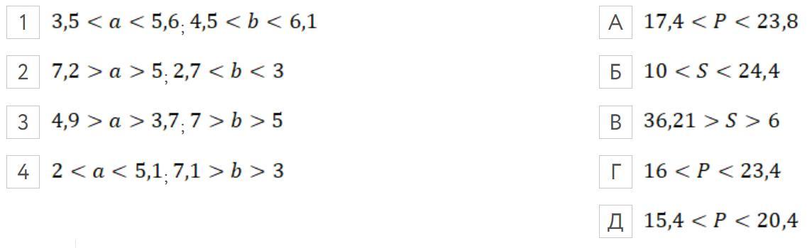 Установіть відповідність між вимірами сторін прямокутника а і b (1-4) та оцінкою його периметра Р або площі S (А-Д).