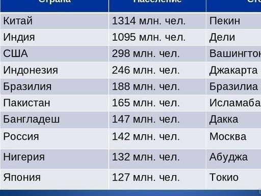 Упражнения 27. Численность населения какой страны больше: 1) Индии или Китая; 2) Казахстана или Монголии; 3) России или Японии? (Используйте данные таблицы 3.)