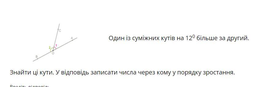 Один із суміжних кутів на 120 більше за другий. Знайти ці кути. У відповідь записати числа через кому у порядку зростання.