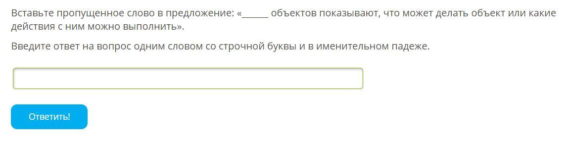 Вставьте пропущенное слово в предложение: «______ объектов показывают, что может делать объект или какие действия с ним можно выполнить» Введите ответ на вопрос одним словом со строчной буквы и в именительном падеже.