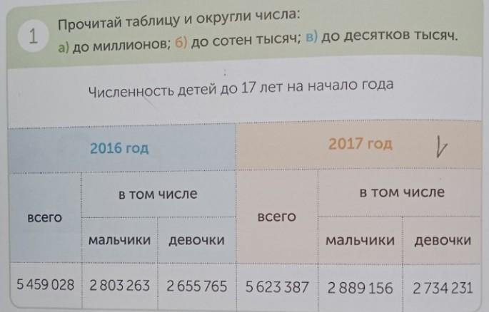 Прочитай таблицу и округли числа: 1 а) до миллионов; б) до сотен тысяч; в) до десятков тысяч. всего Численность детей до 17 лет на начало года 2016 ГОД в том числе мальчики Девочки всего 2017 ГОД В ТОМ ЧИсле мальчики V 5459 028 2803 263 2655 765 5623 387 2889 156 Девочки 2734231
