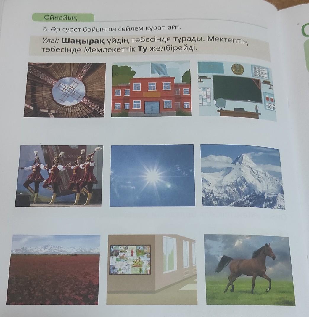 Ойнайық 6. Әр сурет бойынша сейлем курап айт. Үлгі: Шаңырақ үйдің төбесінде тұрады. Мектептің тебесiнде Мемлекеттік Ту желбірейді.