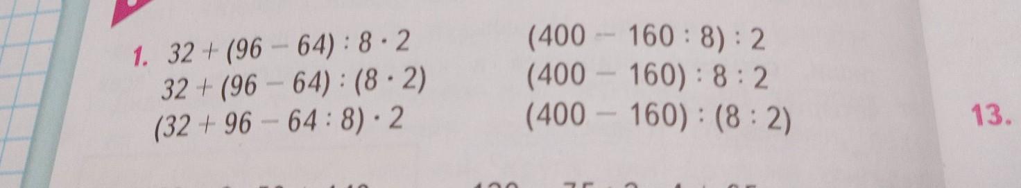 1. 32+(96-64):8-2 32+(96-64): (8-2) (32+96-64:8)-2 (400-160:8): 2 (400-160): 8:2 (400-160): (8:2)