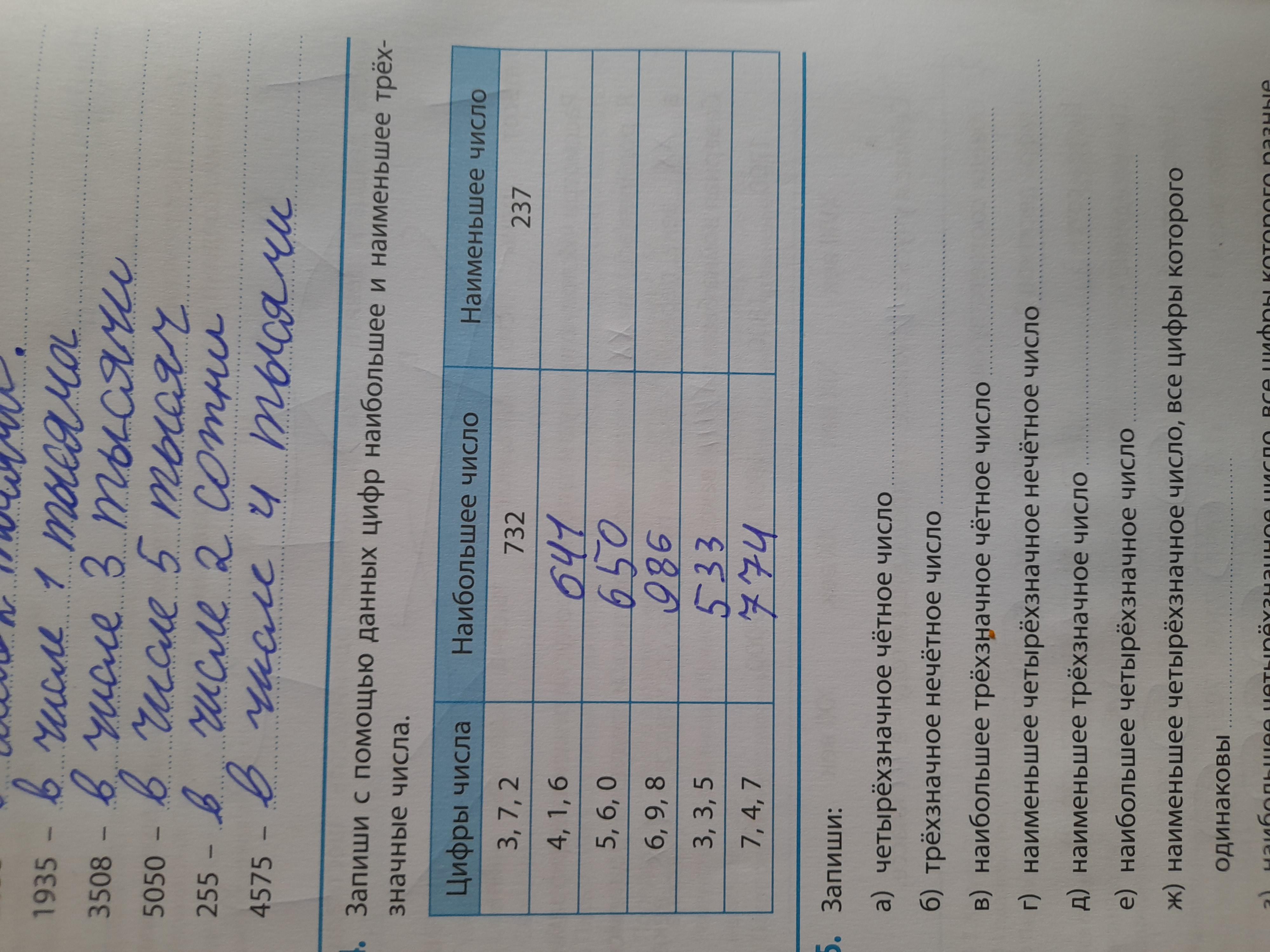Запиши с помощью данных цифр наибольшее и наименьшее трёхзначные числа.Задание номер 4