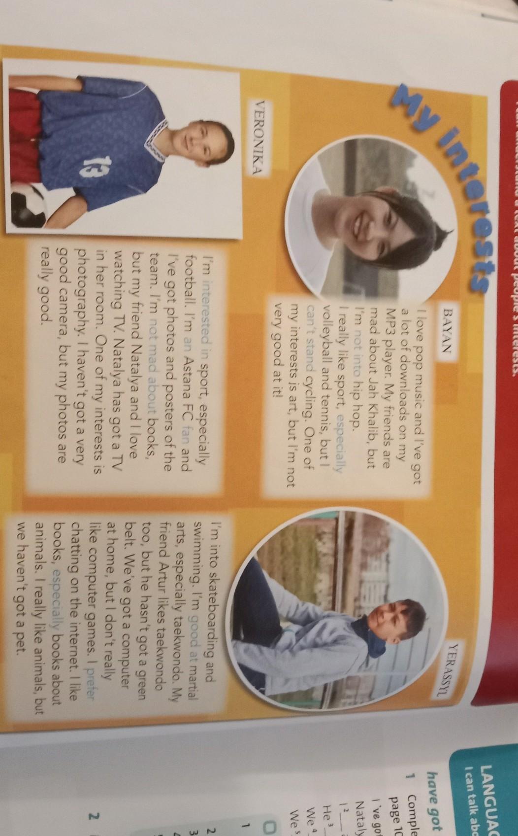 1 Look at the photos. What do you think Bayan, Veronika and Yerassyl are interested in?. надо определить по этой картинке