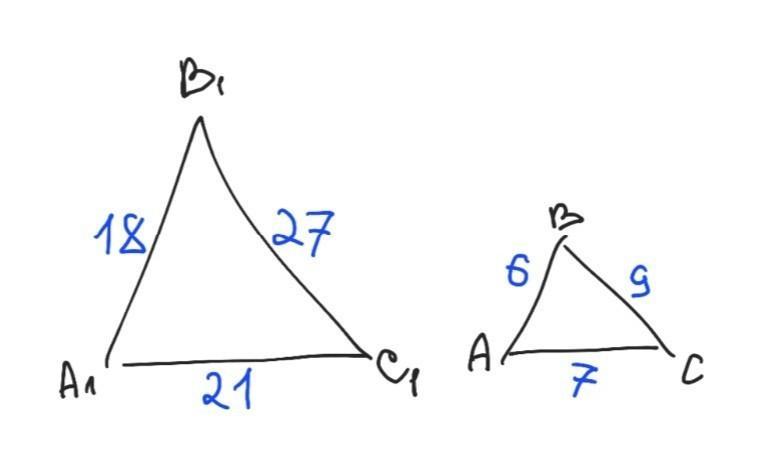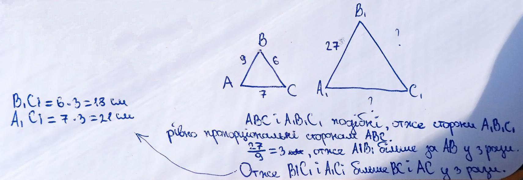 4. Сторони трикутника АВС дорівнюють 9 см, 6 см. 7 см, а більша сторона подібного йому трикутника А,В,С, дорівню 27 см. Знайдіть iншi сторони трикутника А,В,С..
