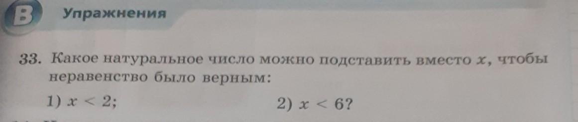 B Упражнения 33. Какое натуральное число можно подставить вместо х, чтобы неравенство было верным: 1) x < 2; 6 2) x < 6?