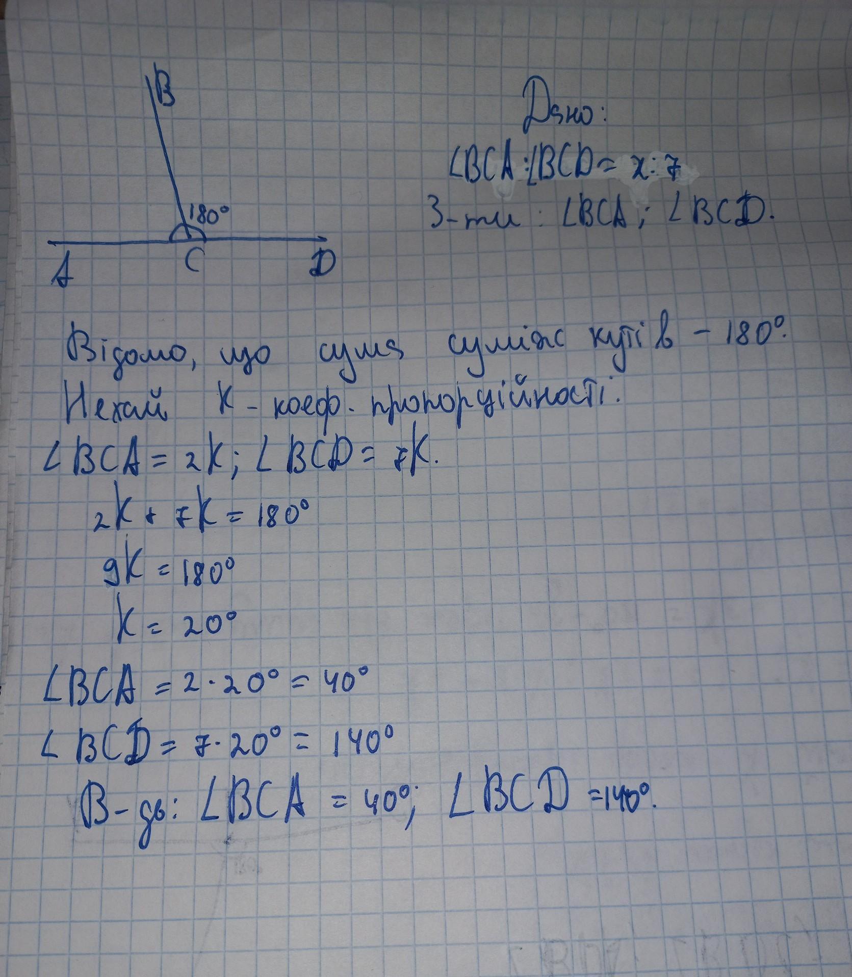 7. Два суміжні кути відносяться, як 2 : 7. Знайдіть ці кути. (Схема: рисунок, дано, решение, ответ)