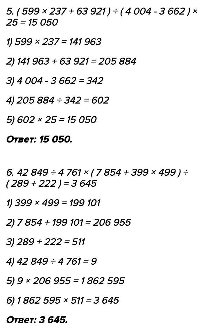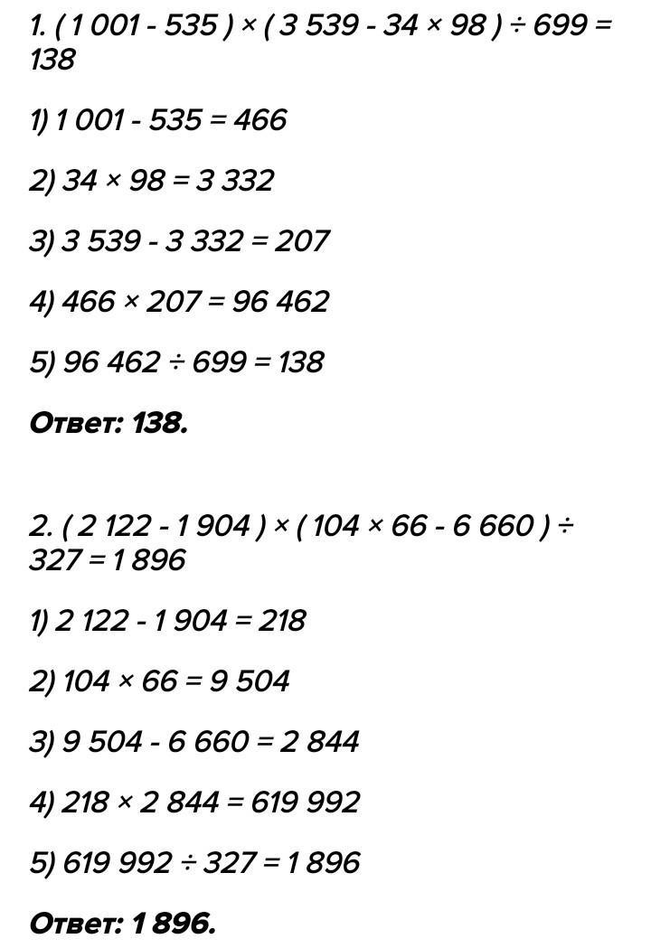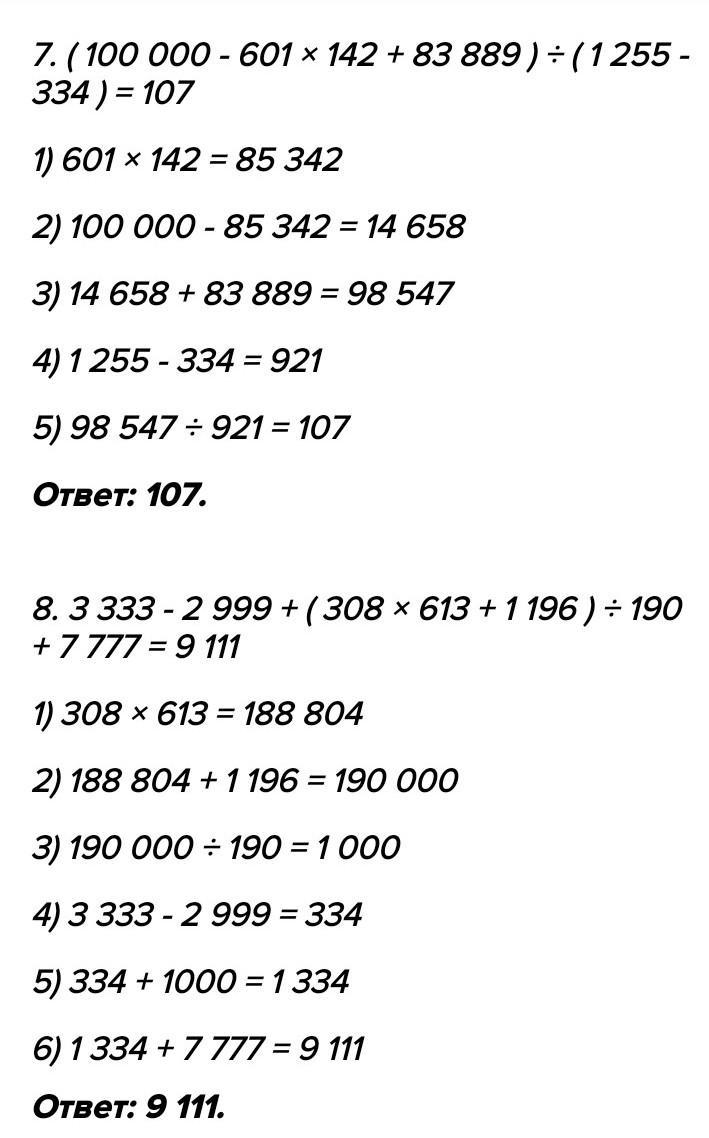 55. Вычислите: 1) (1001 - 535) (3539- 3498): 699; 2) (2122-1904) (104 66 - 6660): 327; 3) (4704 98 + 330) 309 : (901 - 334); 4) 606 (1111 - 943): (8180 - 38 202); 5) (599 237 +63 921) (4004 - 3662) 25; 6) 42 849 4761 (7854 + 399 499): (289 +222); 7) (100 000 - 601 142 + 83 889): (1255 - 334); 8) 3333 - 2999 + (308 613 + 1196): 190 + 7777. . Упражнения ● ● ● ● . 56. Найдите значение выражения: • в столбик