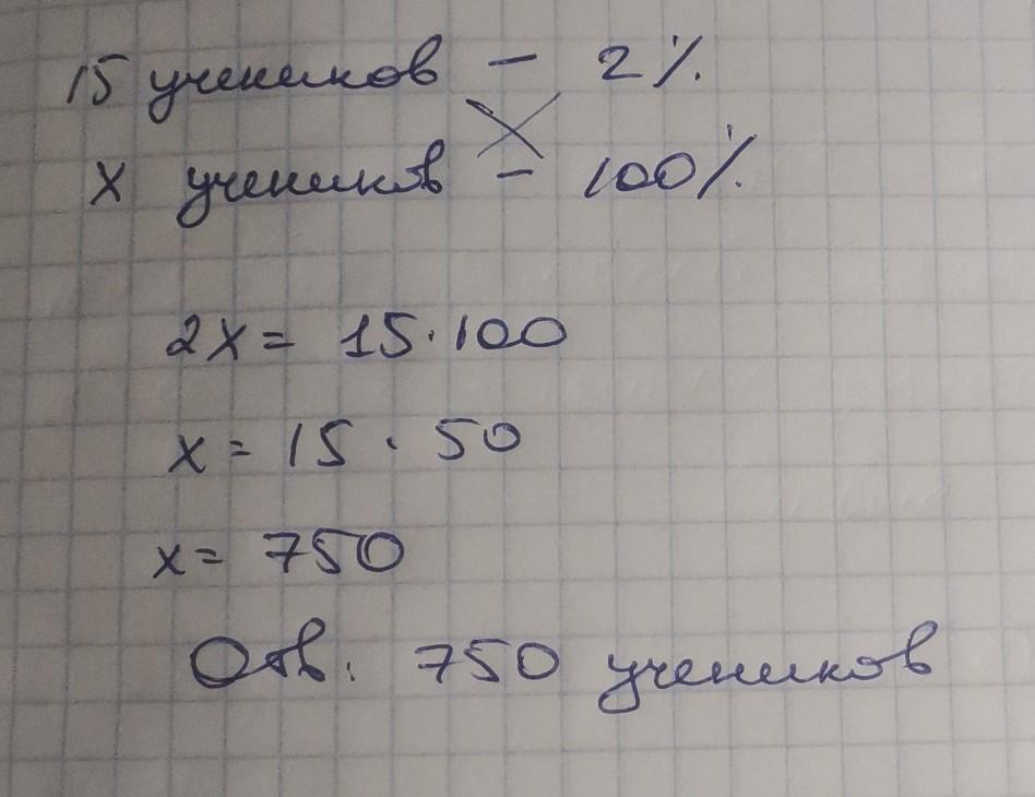 Золоту медаль за успіхи у навчанні отримали 15 випускників, що становить 2% усіх учнів школи. Скільки учнів навчається в цієї школі?