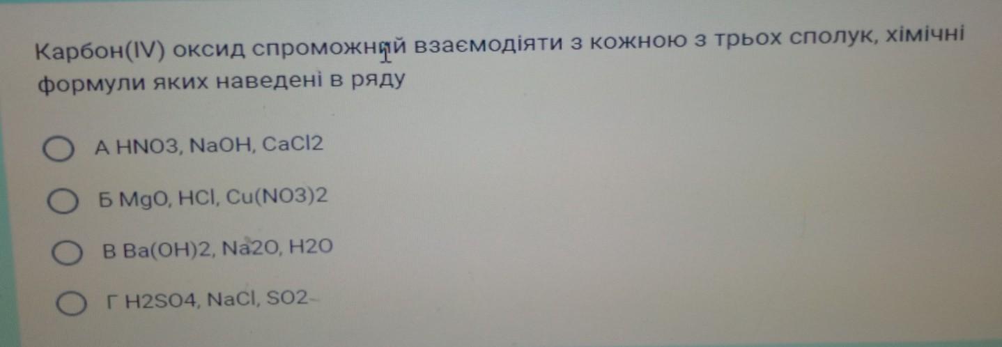 карбон 4 оксид спроможний взаємодіяти з кожною з трьох сполук,хімічні формули яких наведені в ряду
