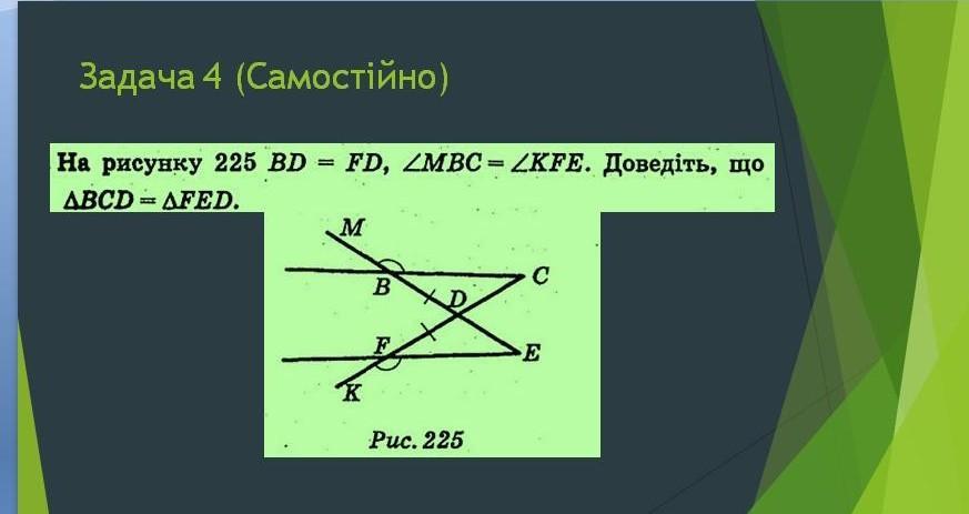 1) <CBD=<EFD, так как по условию равны смежные с ними углы (<MBC=<KFE),