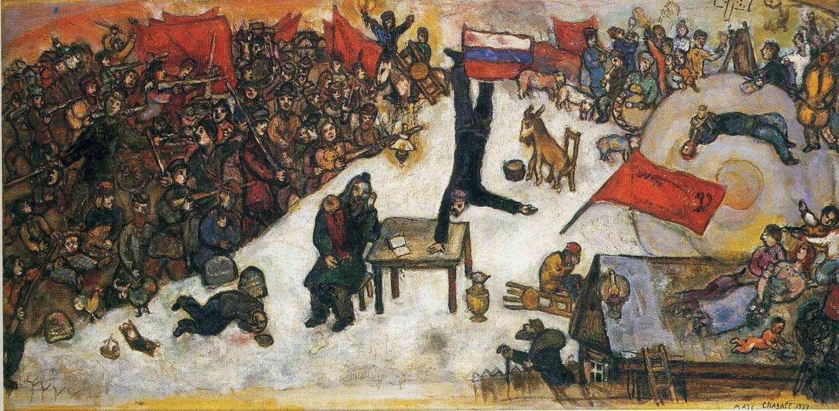На картине показана толпа людей, которые бунтуют, многие люди лежат, стулья разбросаны, автор хотел передать всю страшность обстановки и у него это получилось. Также на картине показан домашний скот, который показывает что в России люди простые. Но люди которым надоел текущий строй державы.