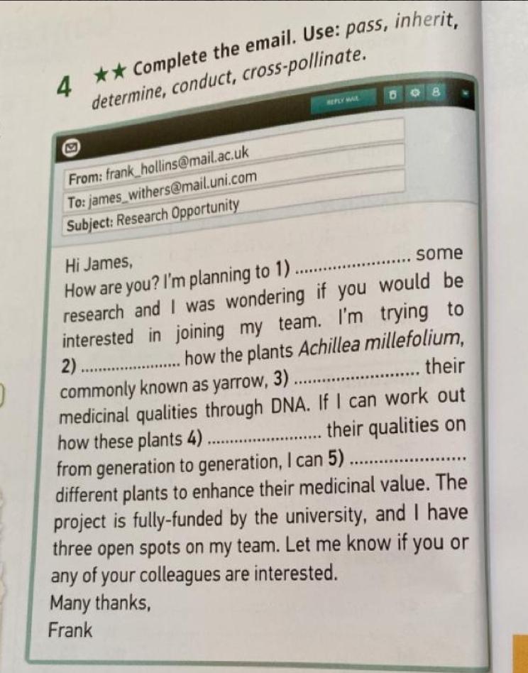 4 ** Complete the email. Use: pass, inherit, determine, conduct, cross-pollinate. From: frank_hollins@mail.ac.uk To: james_withers@mail.uni.com Subject: Research Opportunity REPLY B Hi James, some How are you? I'm planning to 1) research and I was wondering if you would be interested in joining my team. I'm trying to 2) ....................... how the plants Achillea millefolium, ...... their commonly known as yarrow, 3) ................. medicinal qualities through DNA. If I can work out how these plants 4).......... their qualities on ........ from generation to generation, I can 5) different plants to enhance their medicinal value. The project is fully-funded by the university, and I have three open spots on my team. Let me know if you or any of your colleagues are interested. Many thanks, Frank
