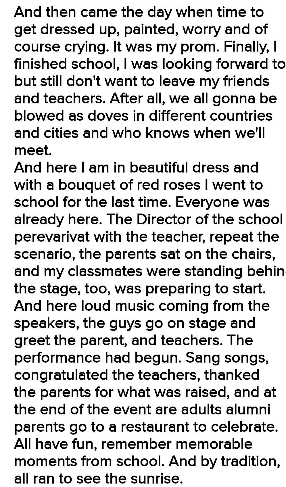 И вот настал тот день, когда время наряжаться, красится, волноваться ну и конечно же плакать. Это был мой выпускной. Наконец то я закончила школу, я так этого ждала, но все равно не хочу покидать своих друзей, учителей. Ведь мы все разлетимся как голуби по разным странам и городам, и кто знает когда мы еще увидимся.И вот я в красивом платье и с букетом красных роз захожу в школу в последний раз. Все уже собрались. Директор школы переговаривает с завучем, повторяют сценарий, родители сидели на креслах, а мои однокласники стояли за сценой, тоже готовились начинать.И вот громкая музыка доносится из колонок, ребята выходят на сцену и приветствуют родителей, учителей. Представление началось. Пели песни, поздравляли учителей, благодарили родителей за то что воспитали, ну и в конце мероприятия уже взрослые выпускники с родителями идут в ресторан, отмечать. Все веселятся, вспоминают запомнившиеся моменты из школы. И по традиции все побежали встречать рассвет.