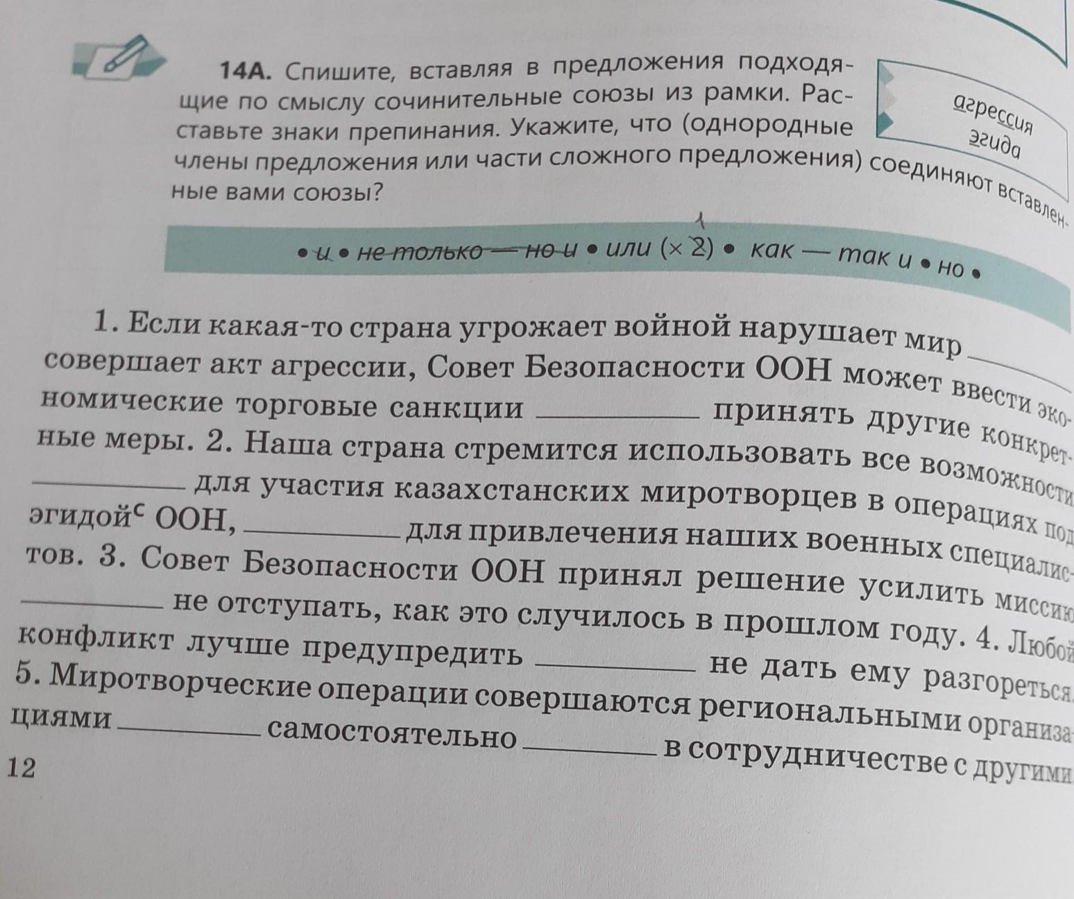 14A. Спишите, вставляя в предложения подходя щие по смыслу сочинительные союзы из рамки. Расставьте знаки препинания. Укажите, что (однородные члены предложения или части сложного предложения) соединяют вставлен- ные вами союзы? - • u • не только-но u • или (x 2) • как агрессия эгида - так и • но • совершает акт агрессии, Совет Безопасности ООН может ввести эко- принять другие конкрет- 1. Если какая-то страна угрожает войной нарушает мир номические торговые санкции ные меры. 2. Наша страна стремится использовать все возможности . для участия казахстанских миротворцев в операциях под эгидойС ООН, - для привлечения наших военных специалис- тов. 3. Совет Безопасности ООН принял решение усилить миссию не отступать, как это случилось в прошлом году. 4. Любой конфликт лучше предупредить не дать ему разгореться. 5. Миротворческие операции совершаются региональными организа- в сотрудничестве с другими циями самостоятельно