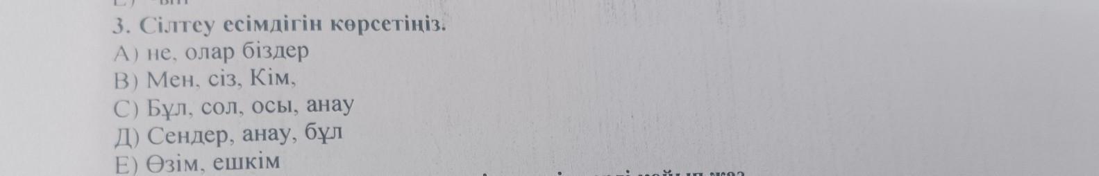 3. Сілтеу есімдігін көрсетіңіз. А) не, олар бiздер В) Мен, сіз, Кім, С) Бұл, сол, осы, анау Д) Сендер, анау, бұл Е) Өзім, ешкім