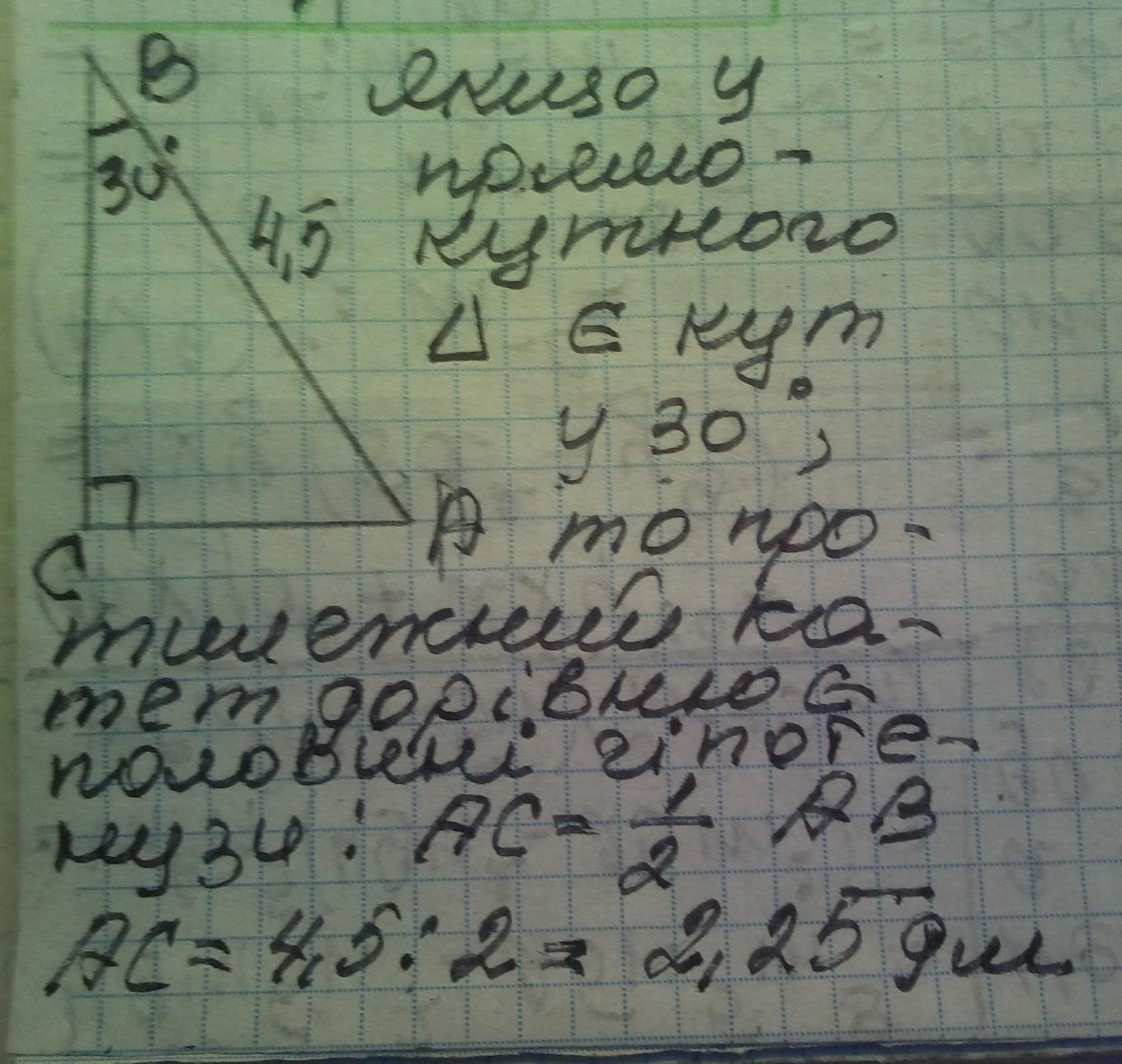 СРОЧНО!!! Дано прямокутний трикутник ABC. Відомо, що гіпотенуза дорівнює 4,5 дм і ∠CBA=30°. Знайди катет AC