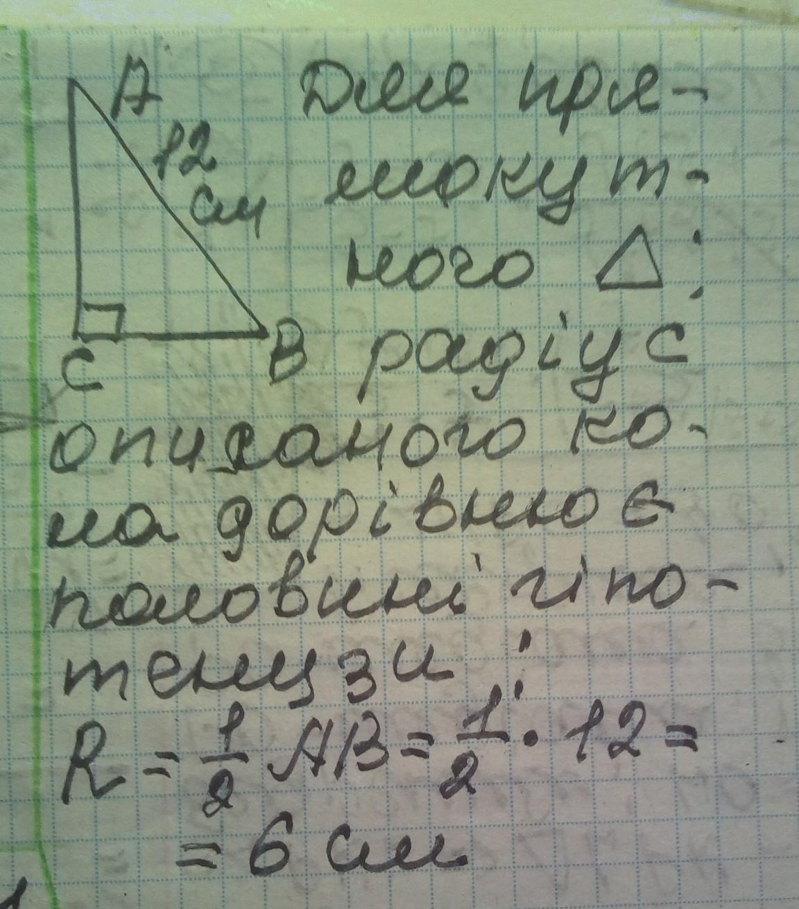 Гіпотенуза прямокутного трикутника дорівнює 12см .Знайдіть його радіус описаного кола Очеень сроооочно