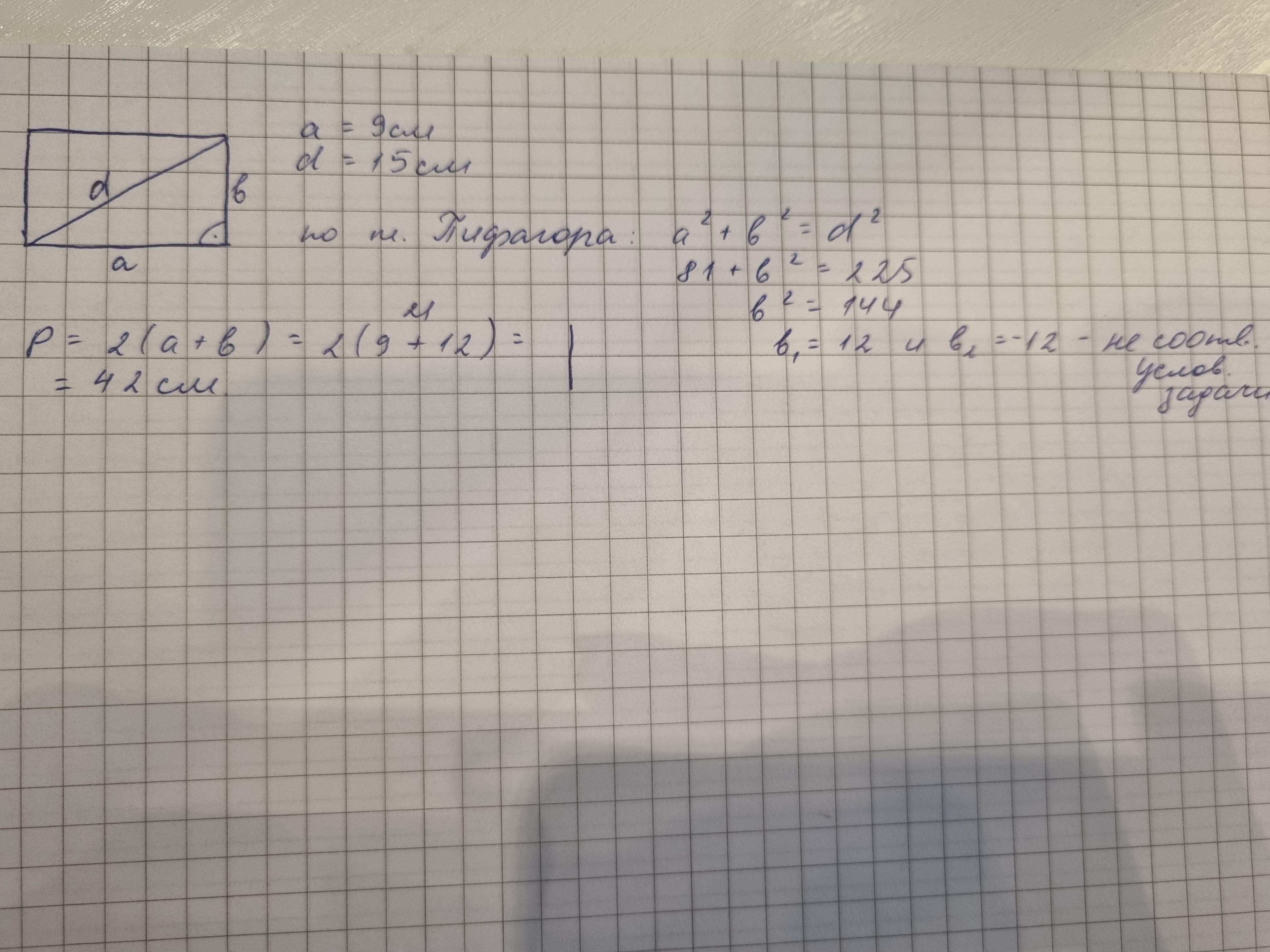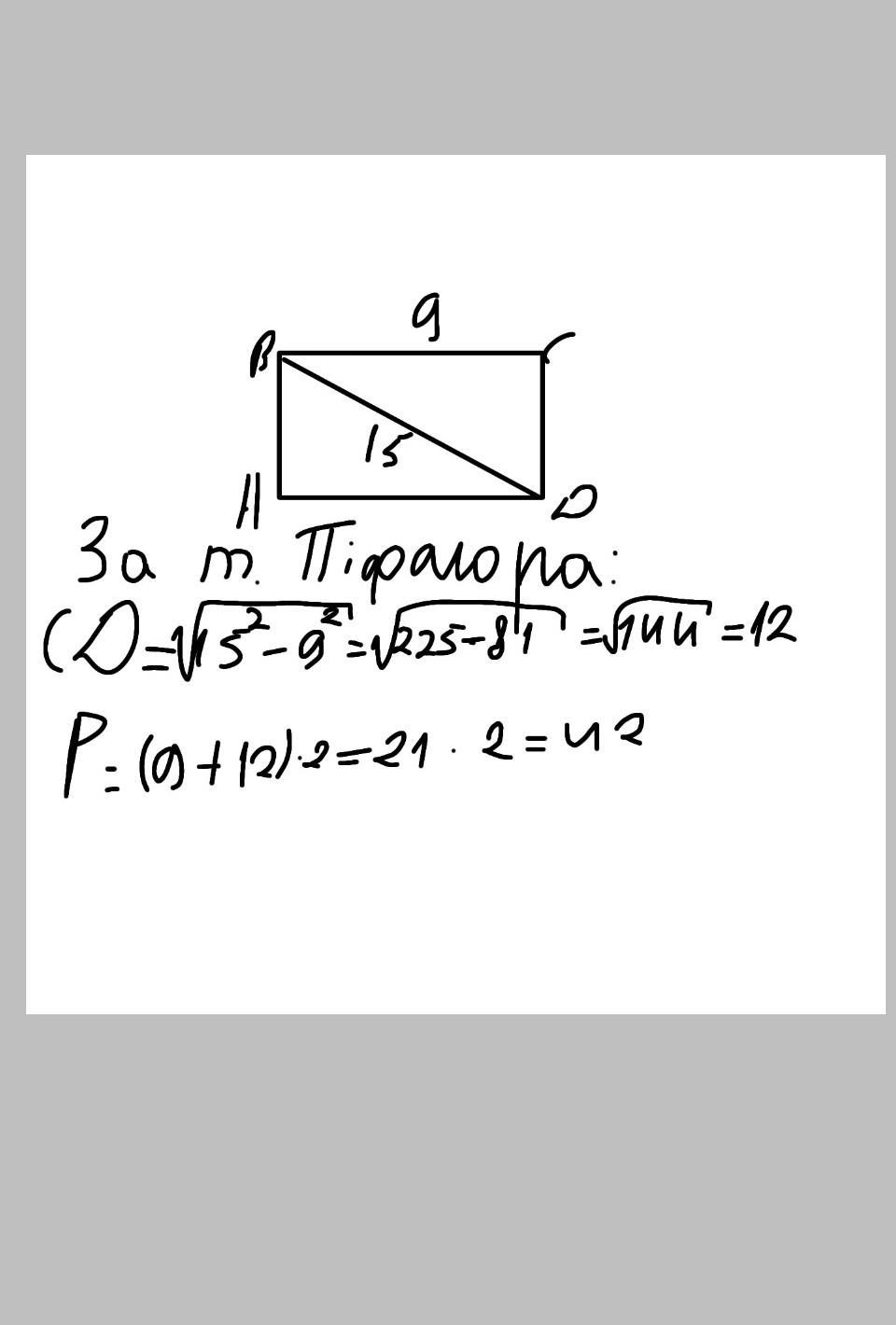 Одна зі сторін прямокутника дорівнює 9 см. а його діагональ - 15 см. Знайди периметр цього прямокутника.