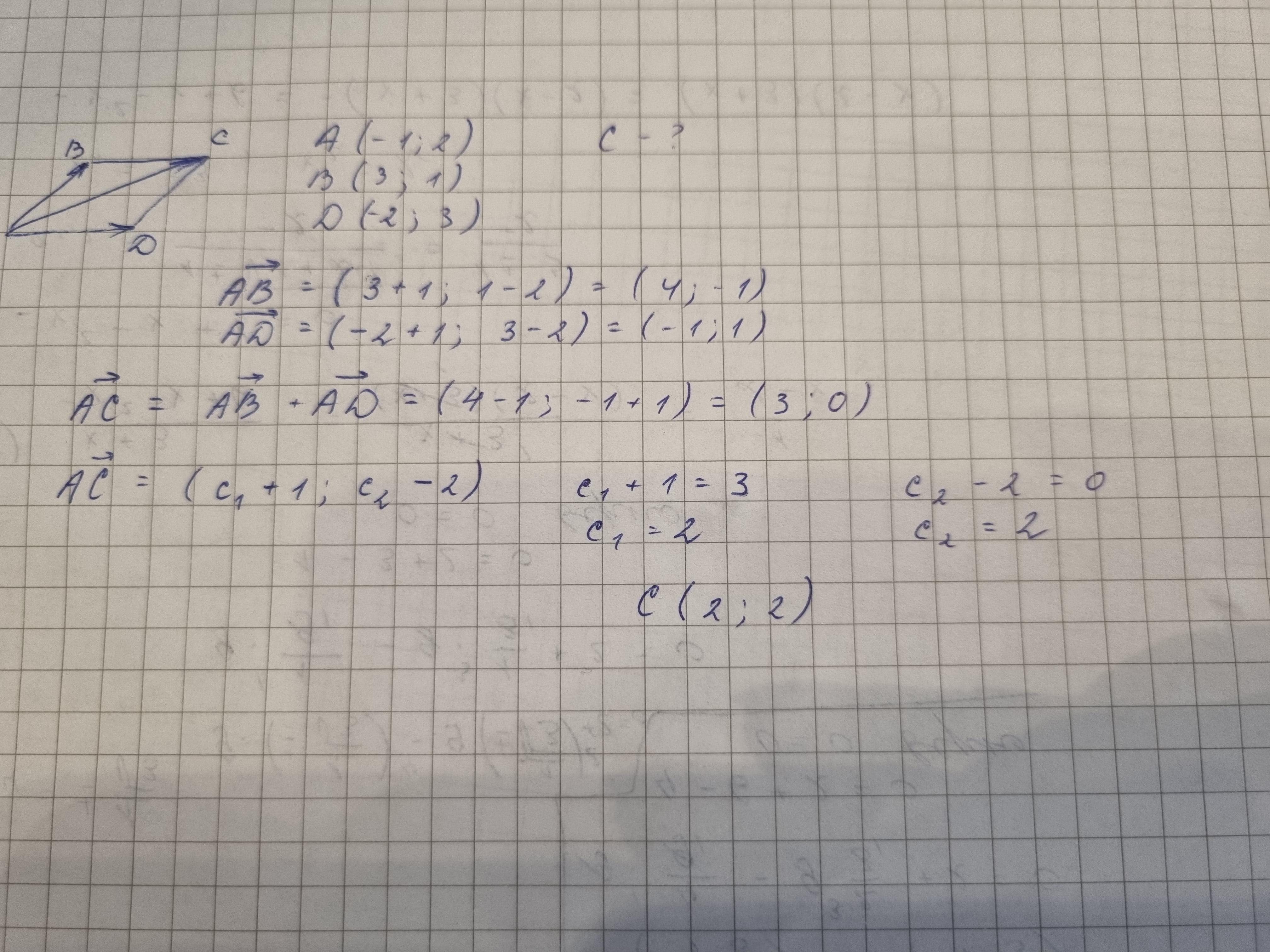 7. Дано три вершини паралелограма ABCD: A(-1;2), B(3;1), D(-2;3). Знайти координати вершини С.