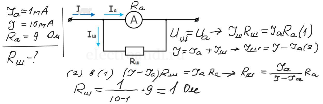 Межу вимірювання міліамперметра, власний опір якого 9 Ом, необхідно розширити від 1 мА до 10 мА. Знайдіть опір шунта.