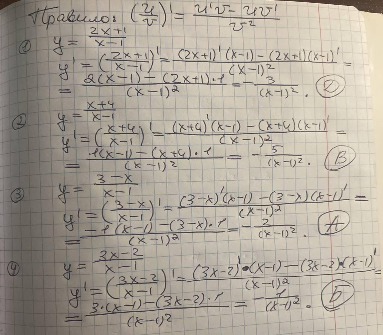 Установіть відповідність між заданими функціями (1-4) та їхніми похідними (А-Д).