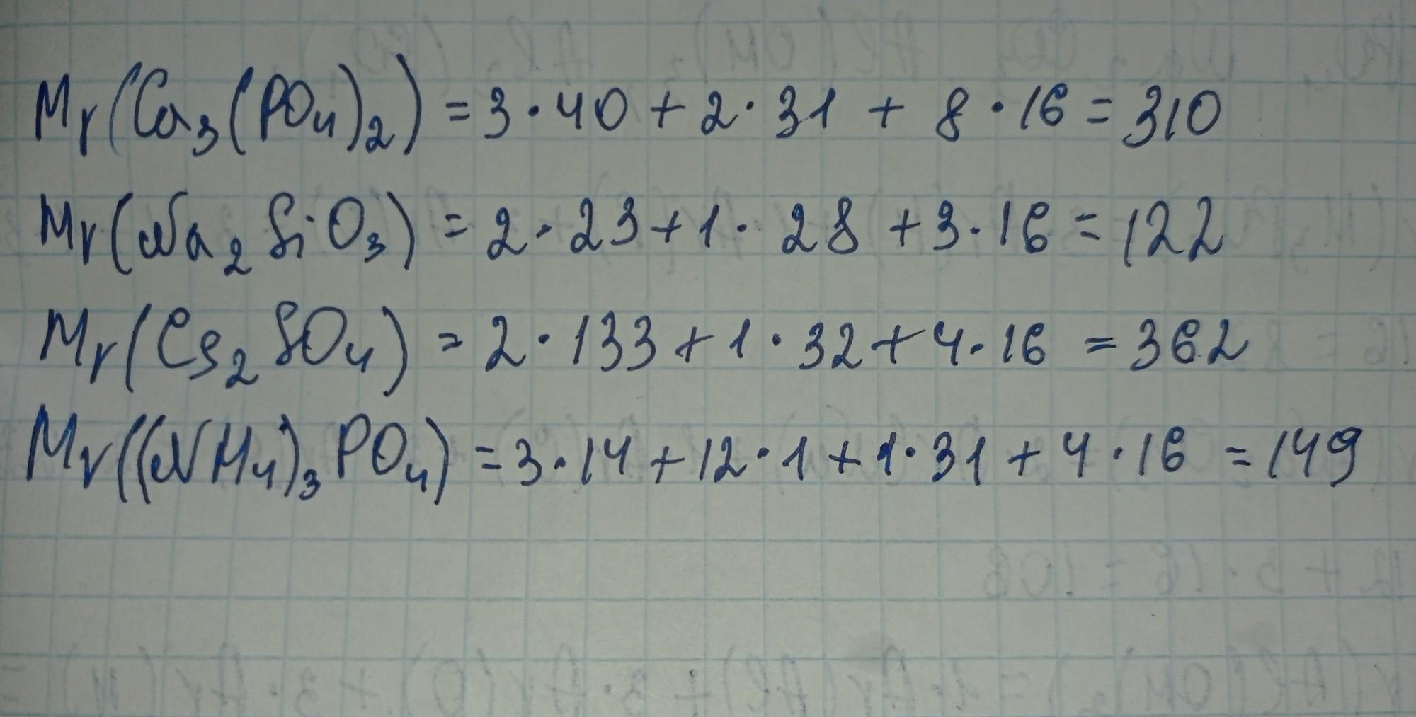 Обчислити Мr сполук: Mr(Ca3(PO4)2)= ; Mr(Na2SiO3)= ; Mr(Cs2SO4)= ; Mr((NH4)3PO4)=