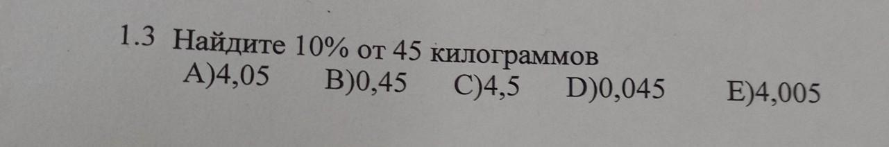 1.3 Найдите 10% от 45 килограммов A)4,05 B)0,45 C)4,5 D)0,045 E)4,005