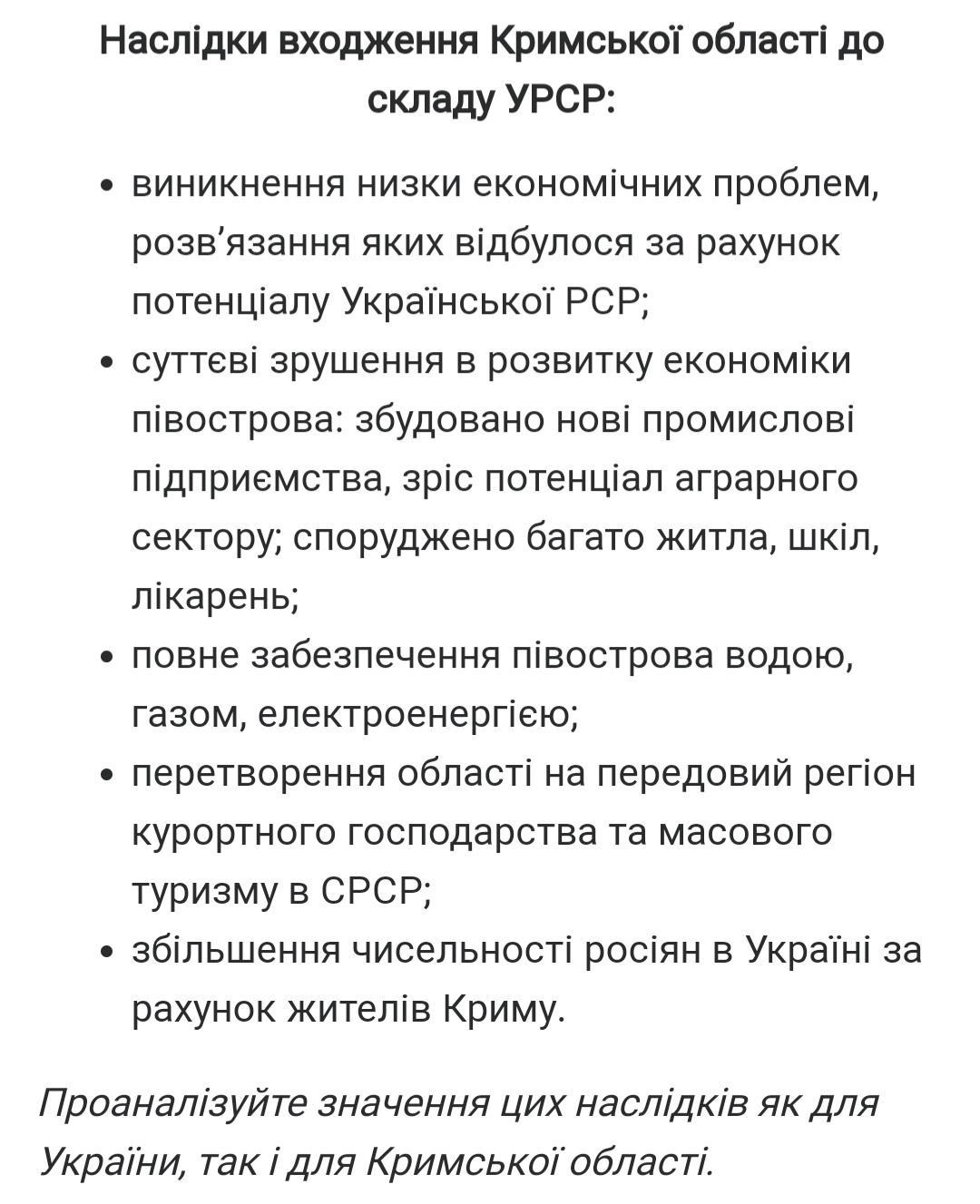 1-2) Кримська область перетворилась на більш економічно стабільну та розвинену область, ніж була в РСРСР. Відкриття лікарень, шкіл та підприємств спонукало людей до переїзду на півострів та підтримання економіки, освоєння земель. УСРСР же отримала ще один регіон, який працював на її економіку і спрощував деякі етапи виробництва