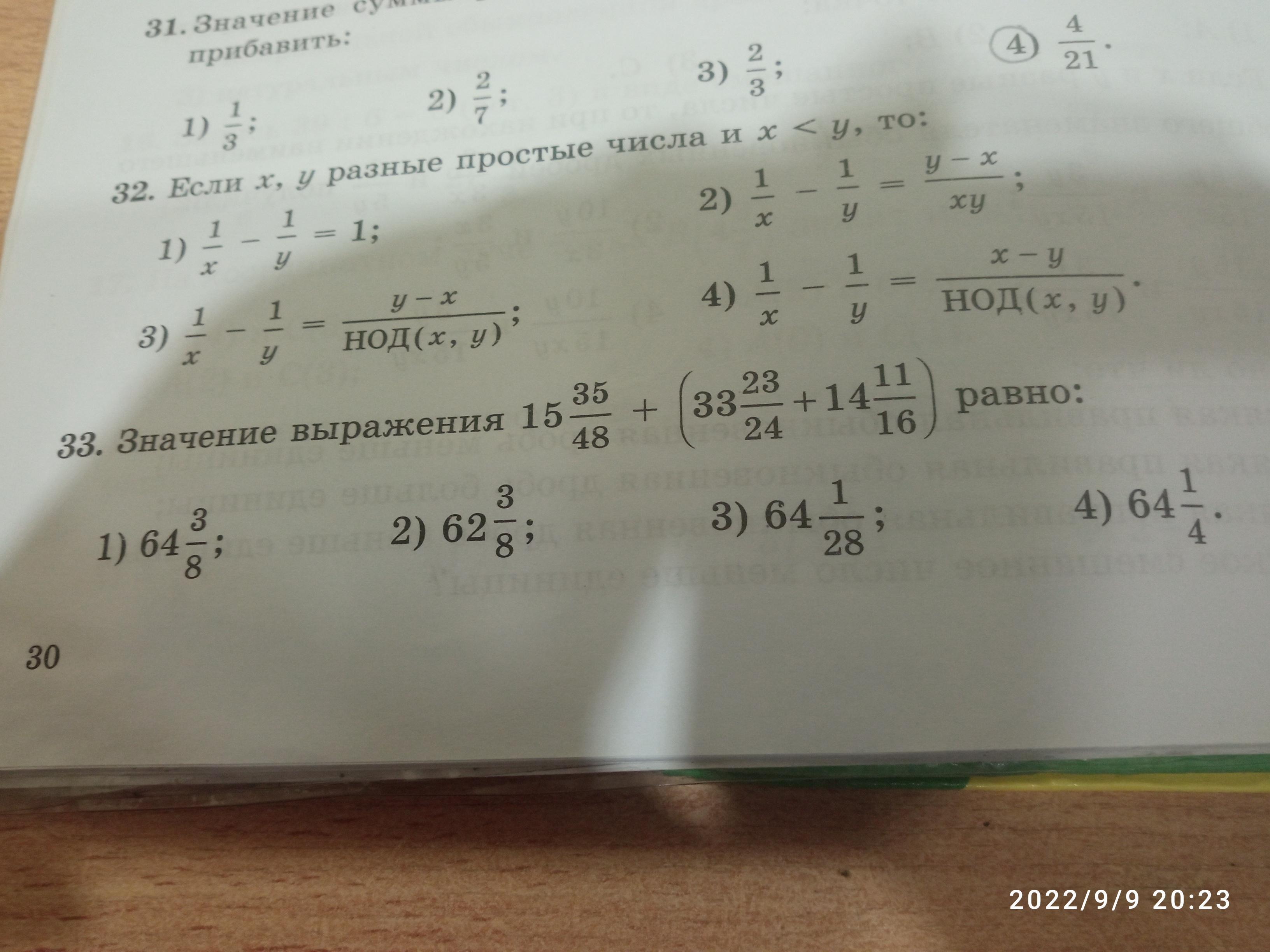 =(15+33+14)+(35/48+46/48+33/48)=62+114/48=62+ 2 + 3/8=64 3/8. Ответ 1)