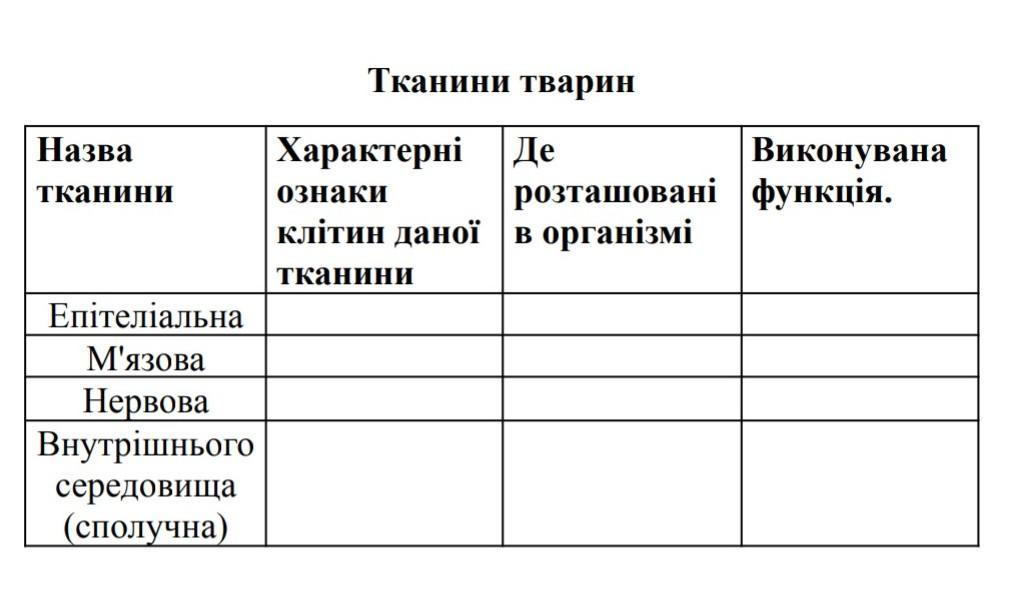 Нервова тканина складається із нейронів, які здатні сприймати подразнення та передавати керівні сигнали від мозку до органів. Завдяки цій тканині відбувається регуляція усіх функцій організму.Сполучні тканини містять дуже багато міжклітинної речовини (у вигляді волокон, кісткових пластинок, хрящів, рідини). Ці особливості будови дозволяють сполучним тканинам виконувати опорну (кістки, хрящі, сухожилля), захисну (підшкірний жир), живильну (кров, лімфа) функції. Сполучні тканини і мають найвищу здатність до регенерації при пошкодженнях.М'язова тканина забезпечує рухові функції організму і складається зі скоротливих клітин або волокон, які з'єднанні між собою за допомогою сполучної тканини. Розрізняють два основні типи м'язової тканини — посмуговану і непосмуговану.Епітеліальна тканина покриває тіло і вистилає його порожнини та внутрішні органи, входить до складу залоз. Різні типи епітеліальної тканини можуть складатися з одного, або декількох щільно прилеглих клітин, між якими практично немає міжклітинної речовини. Епітеліальні тканини виконують захисну, покривну, всмоктувальну, видільну функції.